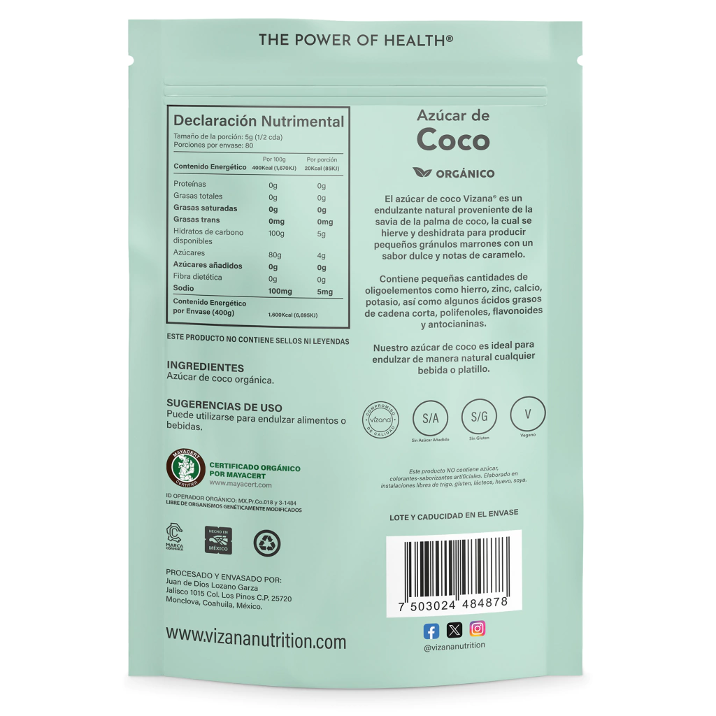 El azúcar de coco Vizana es un edulcorante natural, proveniente de la savia de palma de coco, la cual es hervida y deshidratada, produciendo pequeños gránulos marrones de sabor dulce con notas a caramelo. Contiene pequeñas cantidades de oligoelementos como hierro, zinc, calcio, potasio, algunos ácidos grasos de cadena corta, polifenoles. Flavonoides y antocianidinas.