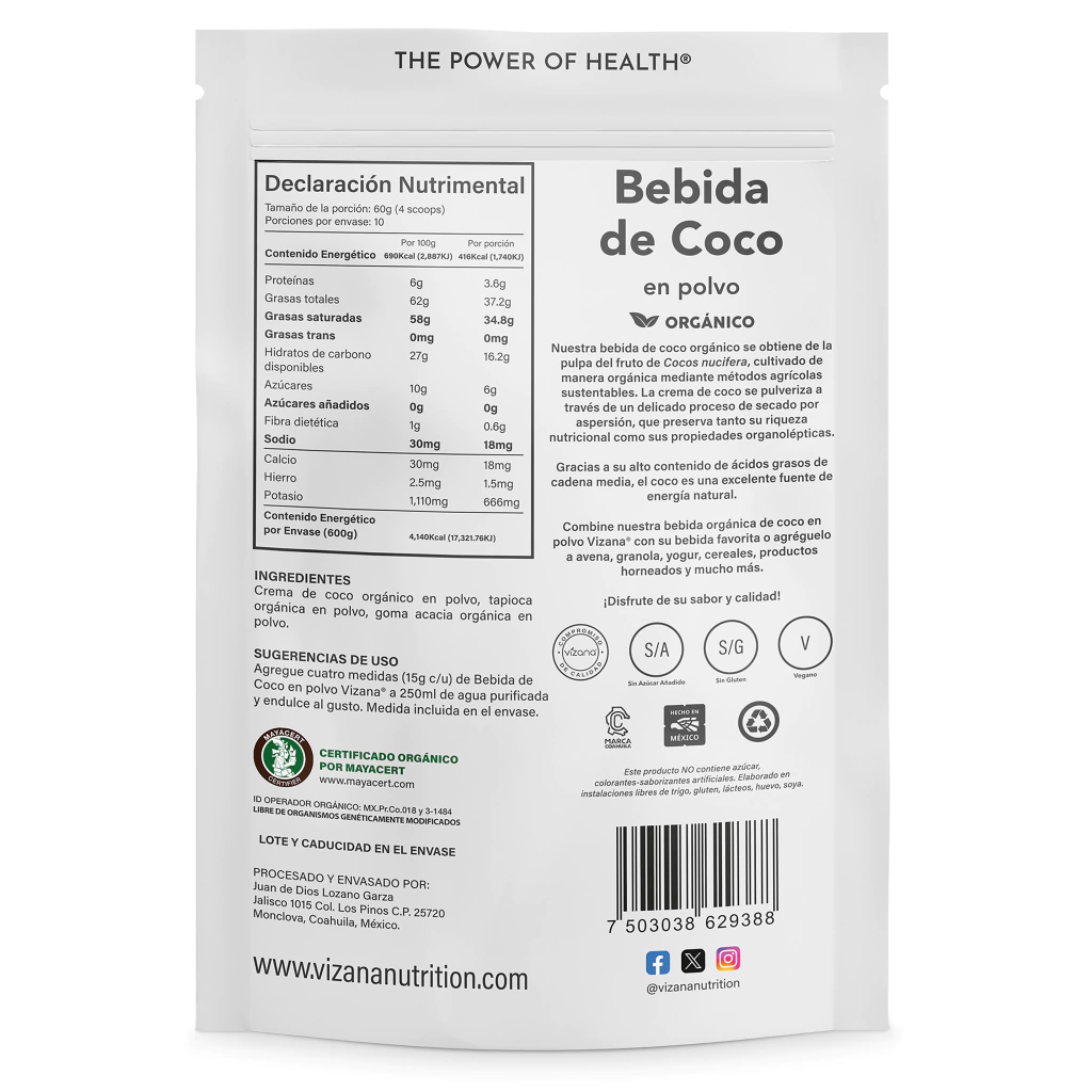 Sugerencia de uso: Agregue cuatro medidas (15g c/u) de Bebida de Coco en polvo Vizana® a 250ml de agua purificada y endulce al gusto. Medida incluida en el envase.