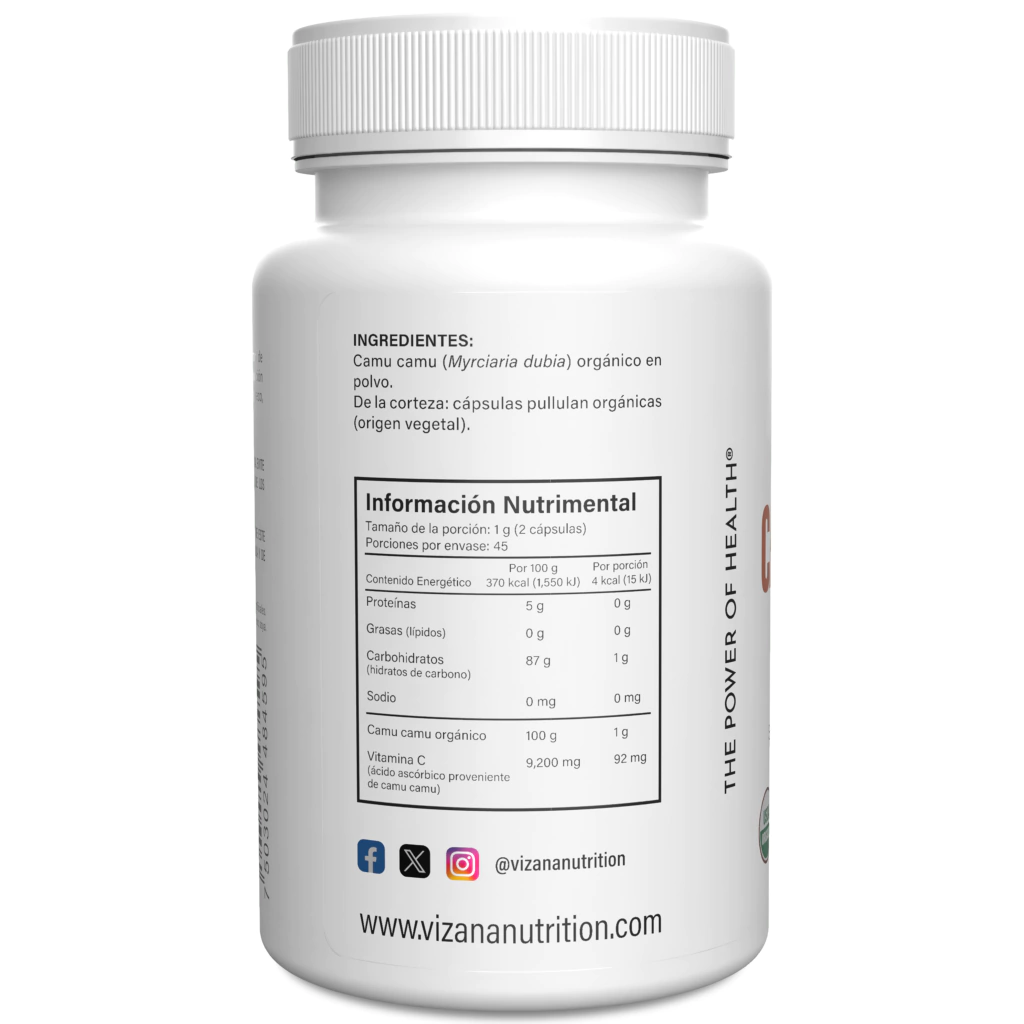 Ingredientes: Camu camu orgánico en polvo. De la corteza: cápsulas orgánicas de origen vegetal.