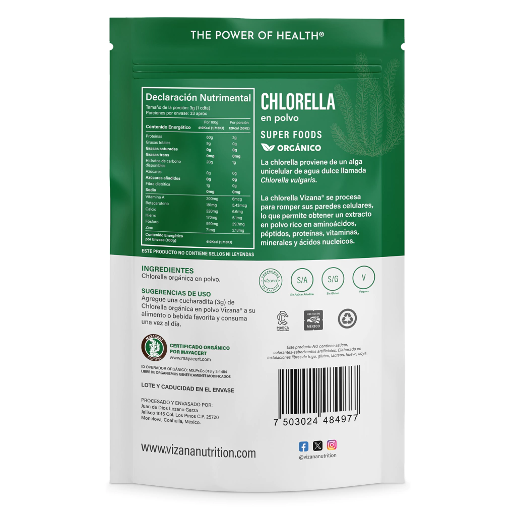 Chlorella es un género de algas verdes (familia Chlorellaceae) que se encuentra sola o agrupada en agua dulce o salada. Chlorella vulgaris es una de las más conocidas. Rico en fitonutrientes, aminoácidos, clorofila, betacaroteno, potasio, fósforo, biotina, magnesio, hierro, zinc, complejo B y el llamado factor de crecimiento celular de Chlorella. Además de vitaminas A, C, D, K, B1, B6 Y B12. Omega 3 y 6. Pigmento natural de clorofila.
