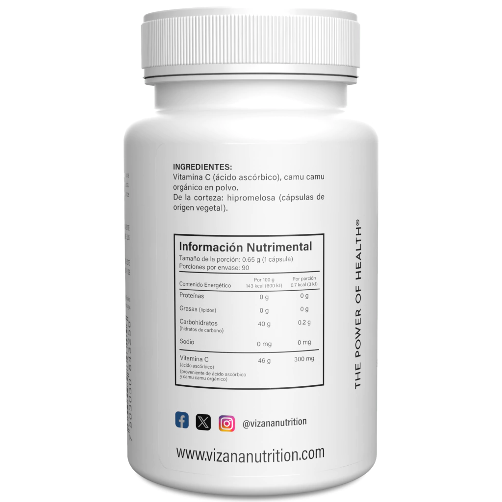 Ingredientes: Ácido ascórbico (vitamina C), camu camu orgánico en polvo. De la corteza: celulosa vegetal
